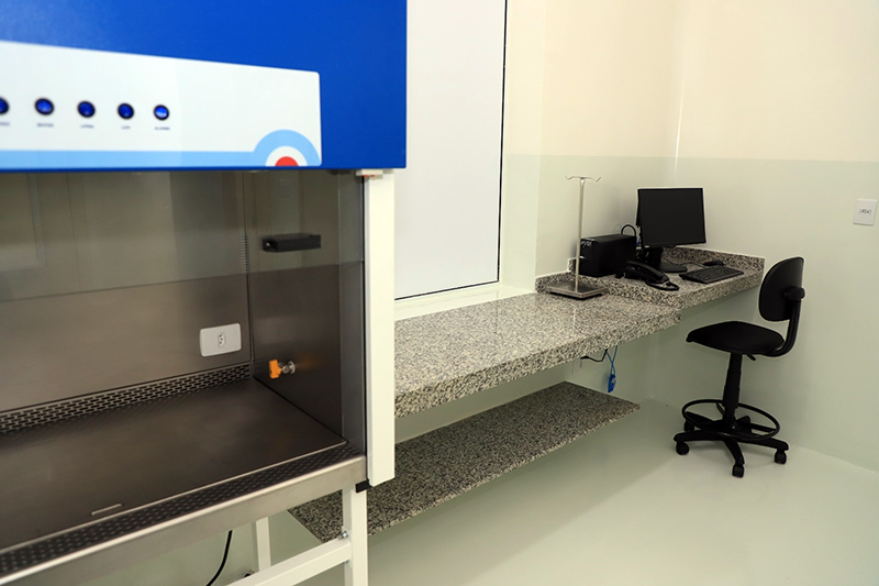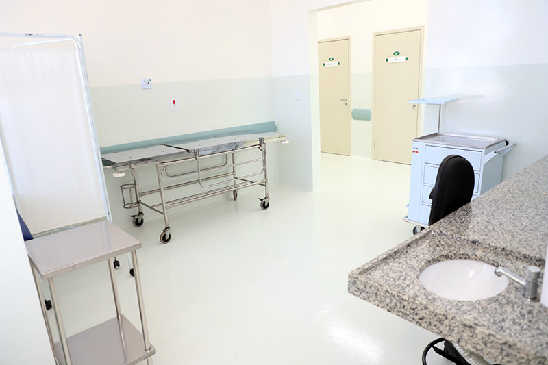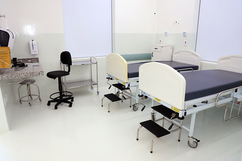 Há ainda materiais de enfermagem, bancadas de trabalho para o preparo de terapias e armários e geladeiras adequados para a conservação de materiais e medicamentos.